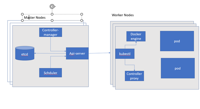 K8s have master Nodes or multi master nodes and worker nodes, where master node manages schedule job for worker node. through the help of apiservers, controllers and schedulers.