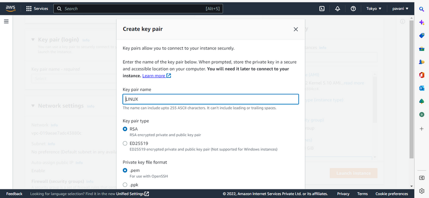 Step 6: Choose the key pair and create the key pair.
