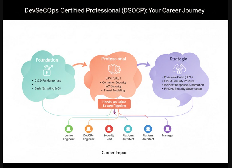 DevSecOps Certified Professional (DSOCP) represents a practical approach to building secure software delivery pipelines. It focuses on integrating security checks, controls, and governance into everyday engineering workflows. Instead of treating security as a final audit step, it promotes continuous validation throughout development and operations. The certification emphasizes production realism, operational trade-offs, and automation-driven security practices aligned with modern platforms.
