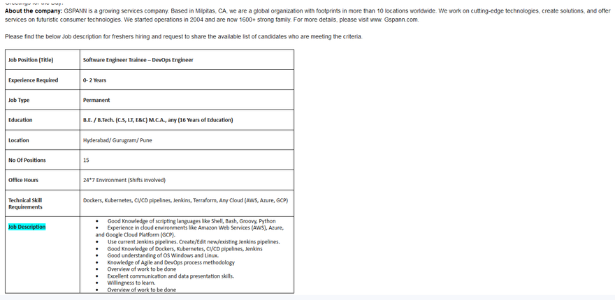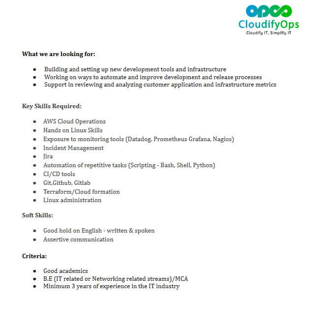 I have attached the detailed job description to this email for your reference. We value education and the potential of fresh graduates, and this is a great opportunity for them to start their careers in a dynamic and growing field. As a Junior Operations Engineer, they will have the chance to work with a team of experienced professionals, learn, and grow in a supportive environment. If you have graduates who meet the criteria and possess a strong understanding of Linux, we would appreciate your assistance in connecting us with them. Please encourage interested candidates to apply. Feel free to direct any questions or inquiries to this email as well. We look forward to the possibility of welcoming new talents from your institute to our team. Thank you for considering our opportunity and supporting the growth of young professionals.