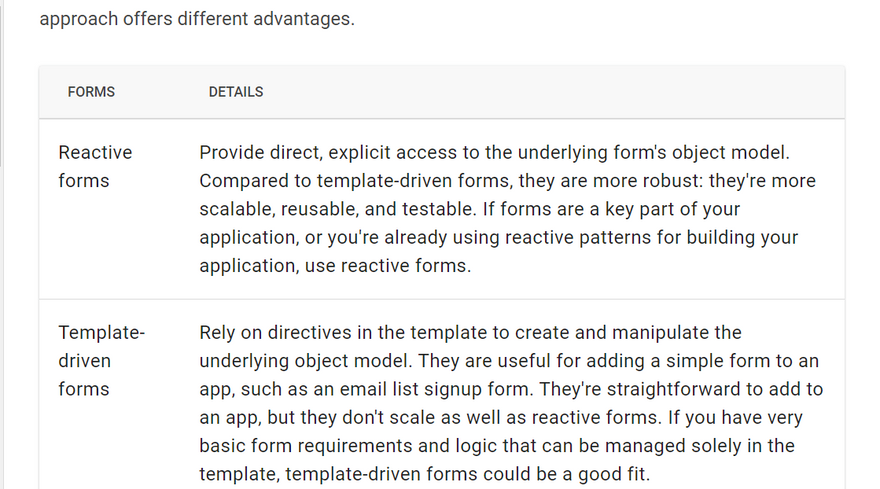 Reactive forms are more scalable than template-driven forms. They provide direct access to the underlying form API, and use synchronous data flow between the view and the data model, which makes creating large-scale forms easier. Reactive forms require less setup for testing, and testing does not require deep understanding of change detection to properly test form updates and validation.