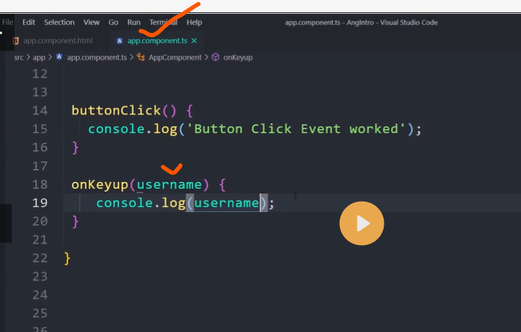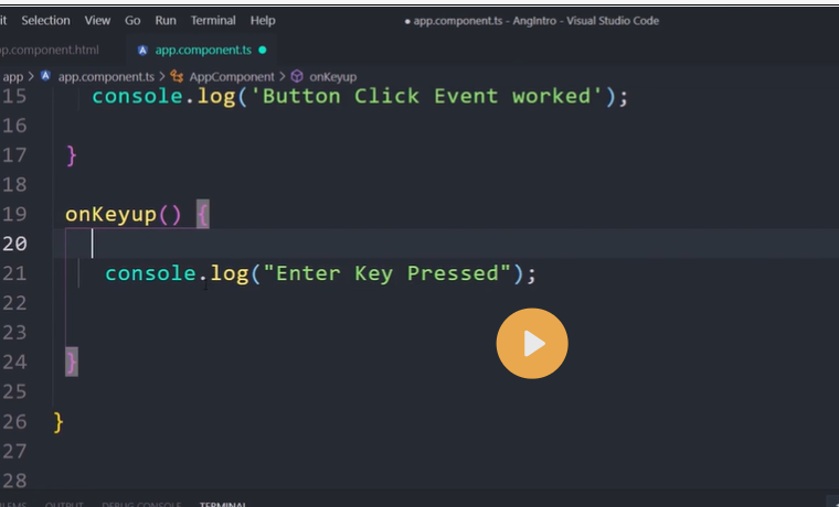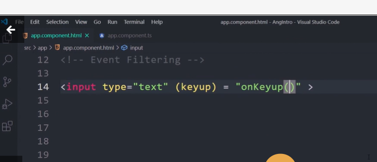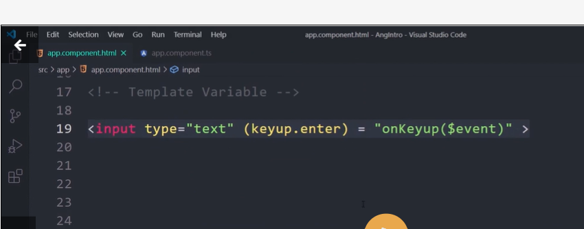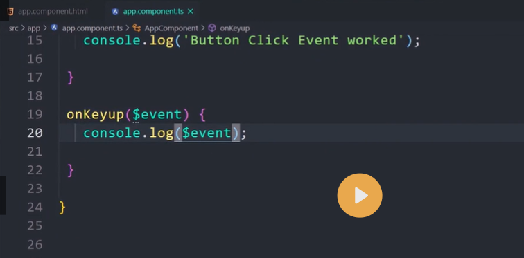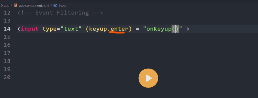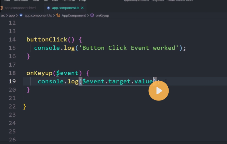 To bind to an event you use the Angular event binding syntax. This syntax consists of a target event name within parentheses to the left of an equal sign, and a quoted template statement to the right.