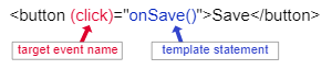 The event binding listens for the button's click events and calls the component's onSave() method whenever a click occurs.