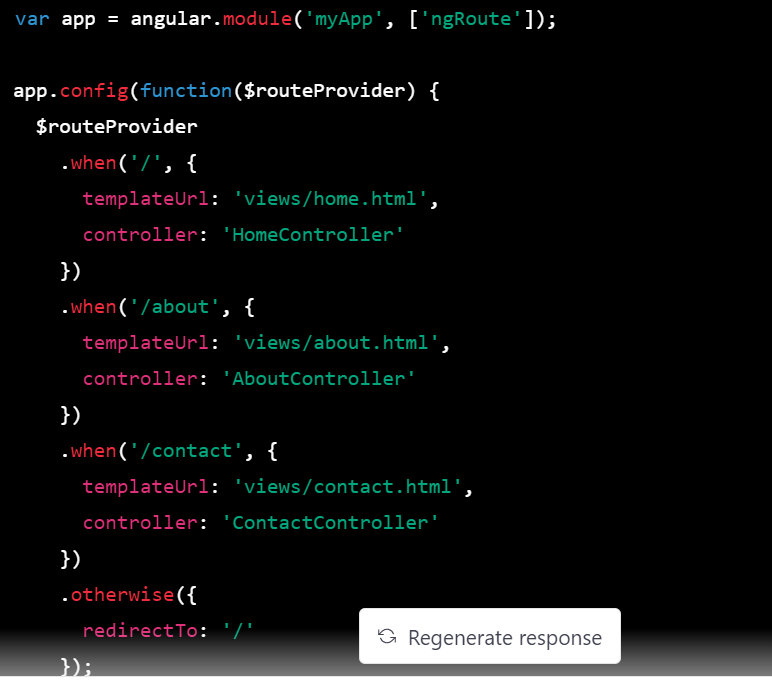 In this example, we've created a new AngularJS module called myApp and injected the ngRoute module as a dependency. We then define our routes using the $routeProvider service, which maps URLs to controllers and views.