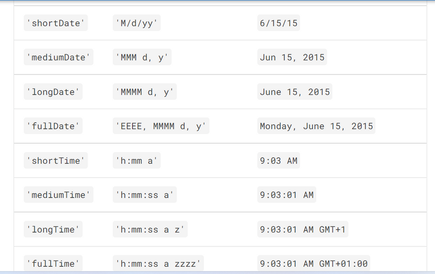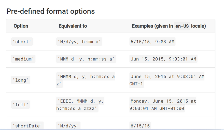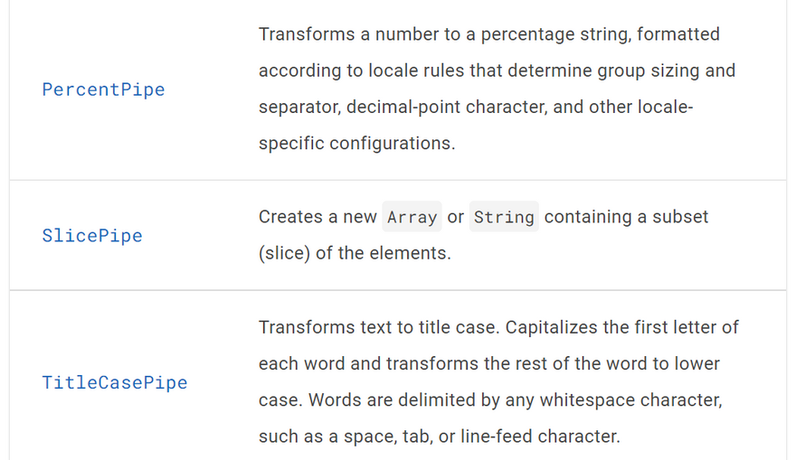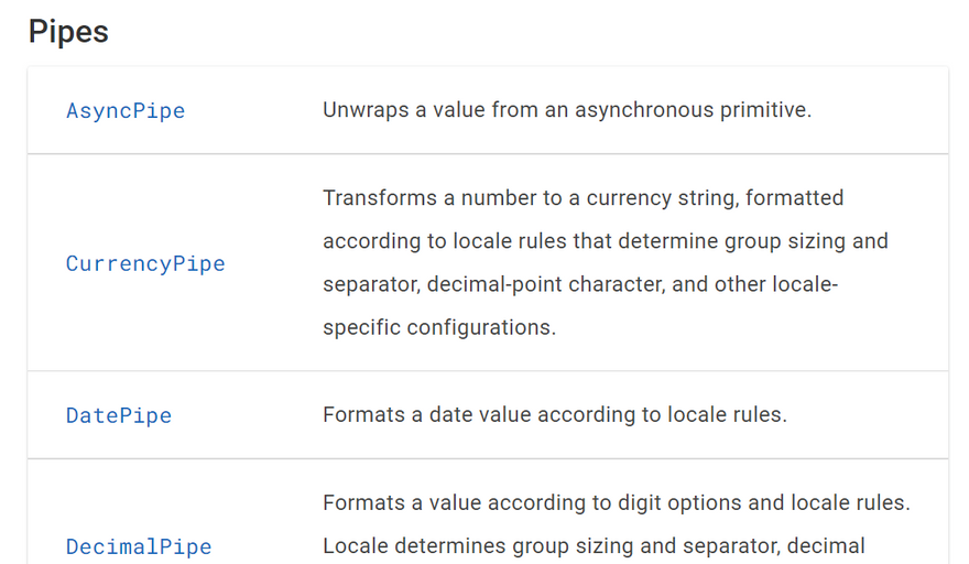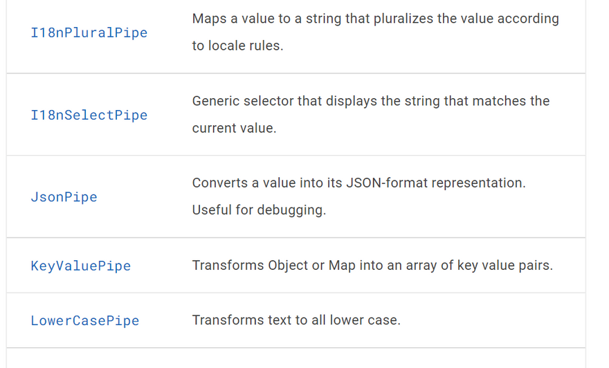 Angular provides built-in pipes for typical data transformations, including transformations for internationalization (i18n), which use locale information to format data. The following are commonly used built-in pipes for data formatting: