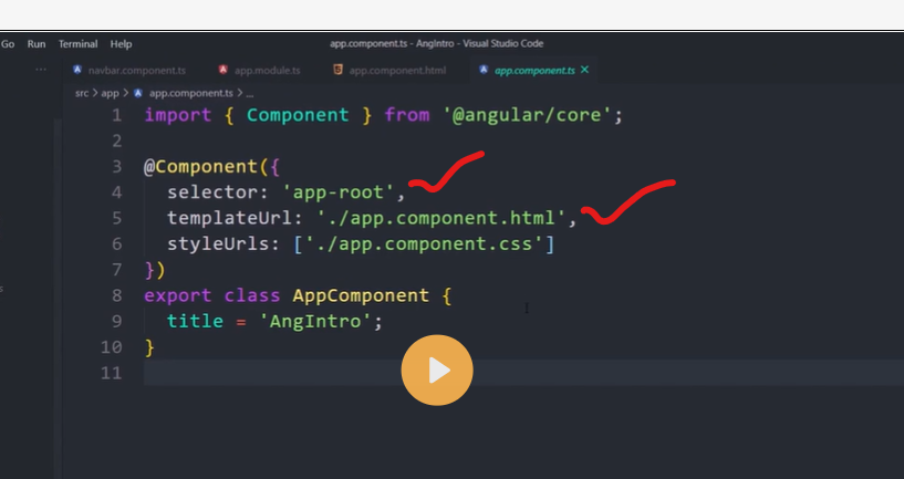 Every component requires a CSS selector. A selector instructs Angular to instantiate this component wherever it finds the corresponding tag in template HTML. For example, consider a component hello-world.component.ts that defines its selector as app-hello-world. This selector instructs Angular to instantiate this component any time the tag appears in a template.