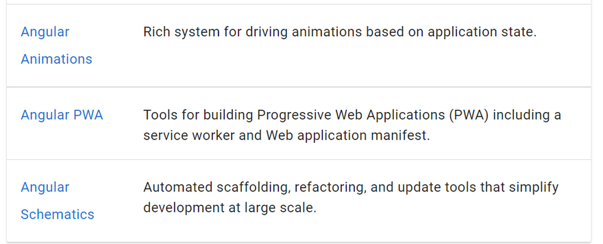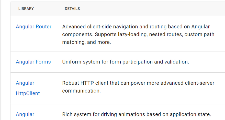 - A collection of well-integrated libraries that cover a wide variety of features, including routing, forms management, client-server communication, and more