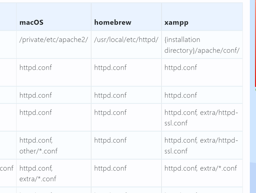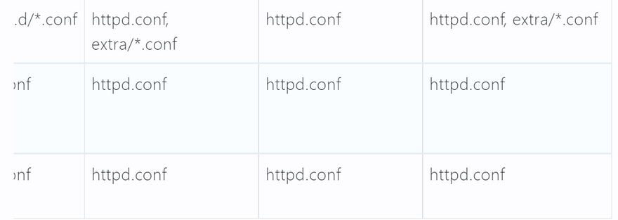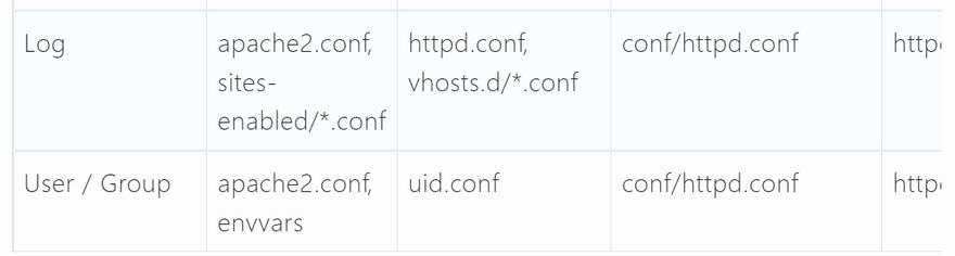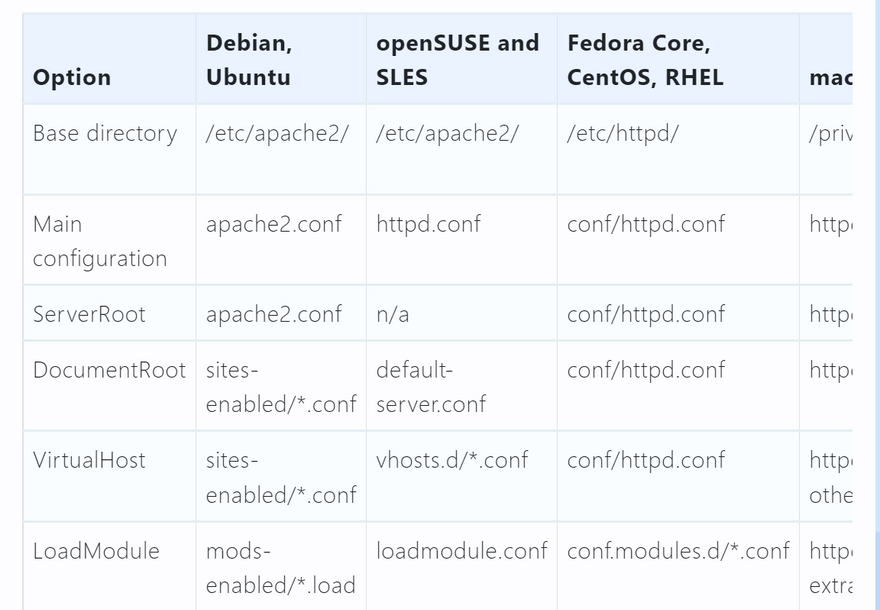 The location of Apache's main configuration file is different for most distributions, and they are also split differently. The following table lists how the configuration file is managed for different distributions: