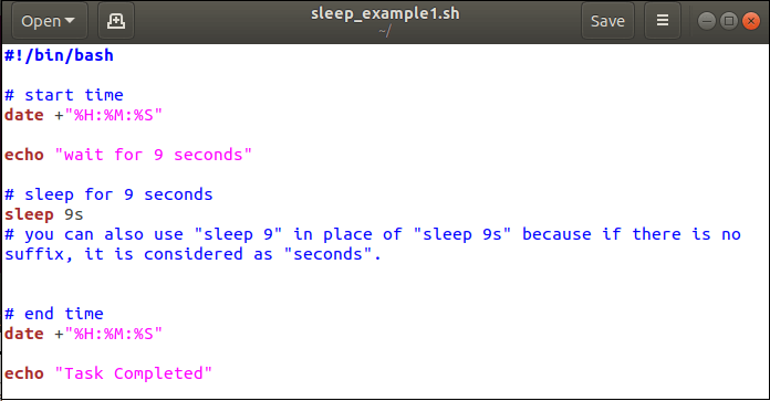 When we run the script, it will print the current time in HH:MM:SS format. Then the echo command will execute and print the message "wait for 9 seconds". Then the sleep command will execute and pause the script for 9 seconds. When the specified time period elapses, the next line of the script will again print the current time. Lastly, the echo command will print the message "Task Completed".