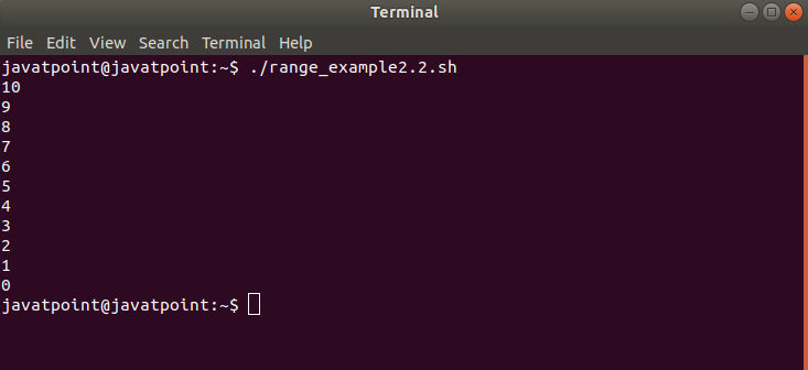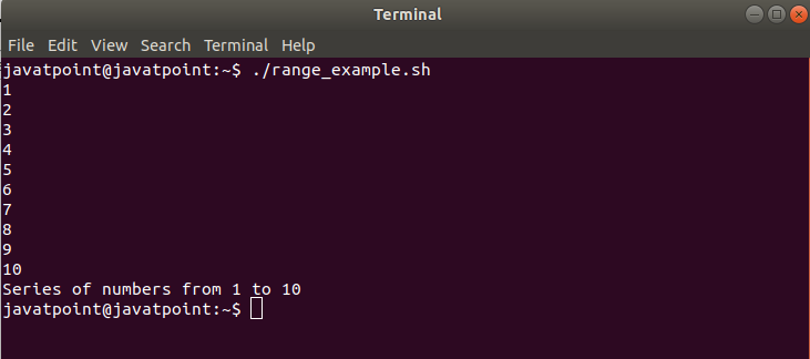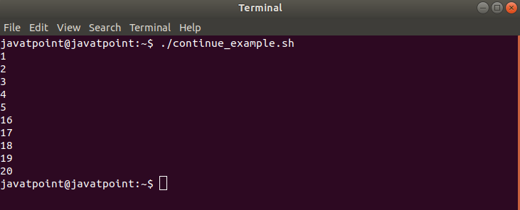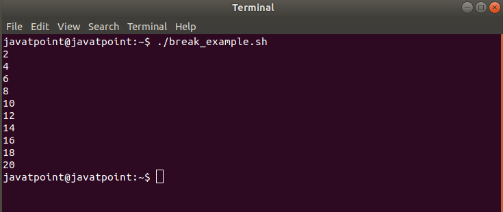 According to the script, the loop is assigned to iterate for ten times. But there is a condition after eight times of iteration which will break the iteration and terminate the loop. The following output will be shown after executing the script.