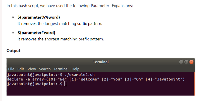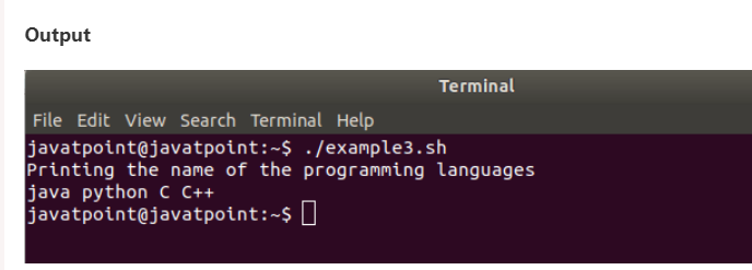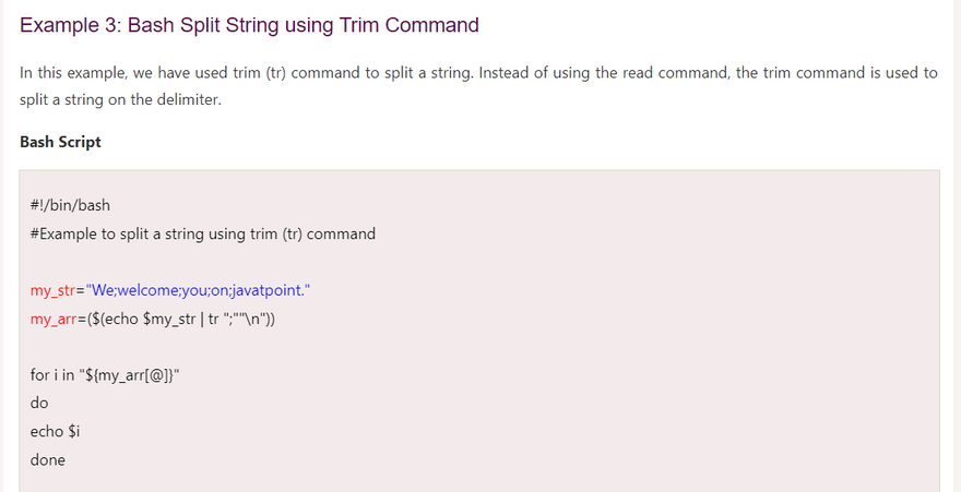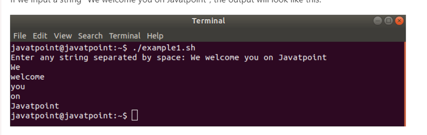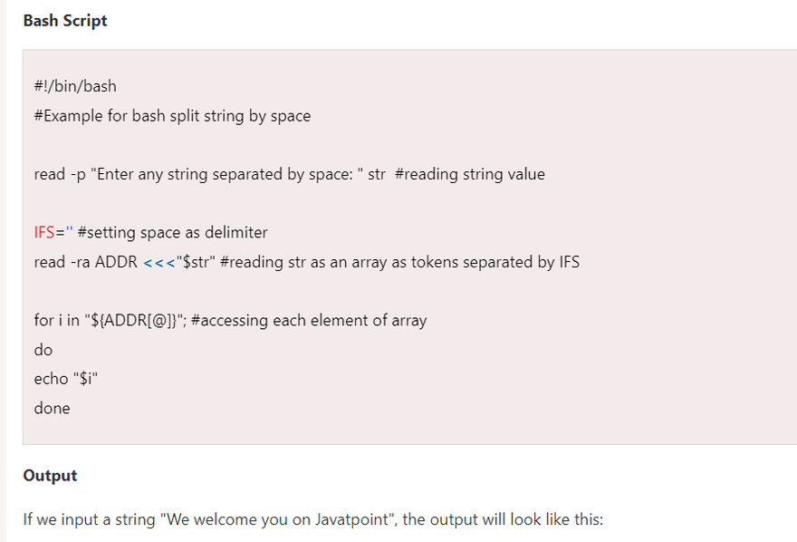 - Then we apply bash 'for' loop to access the tokens which are split into an array. Let's understand this mechanism with the help of some examples: