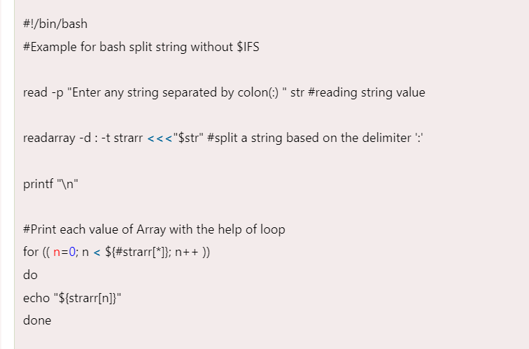 In bash, a string can also be divided without using $IFS variable. The 'readarray' command with -d option is used to split the string data. The -d option is applied to define the separator character in the command like $IFS. Moreover, the bash loop is used to print the string in split form.