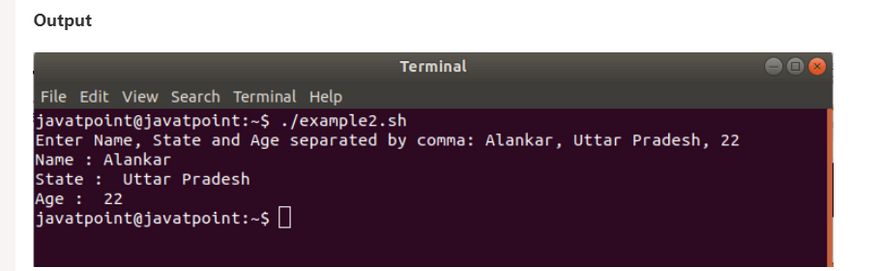 This example defines how a string value can be split without using $IFS. As per the script, a text value should be entered with the colon (:) sign so that it can be split. Check out the bash script below: