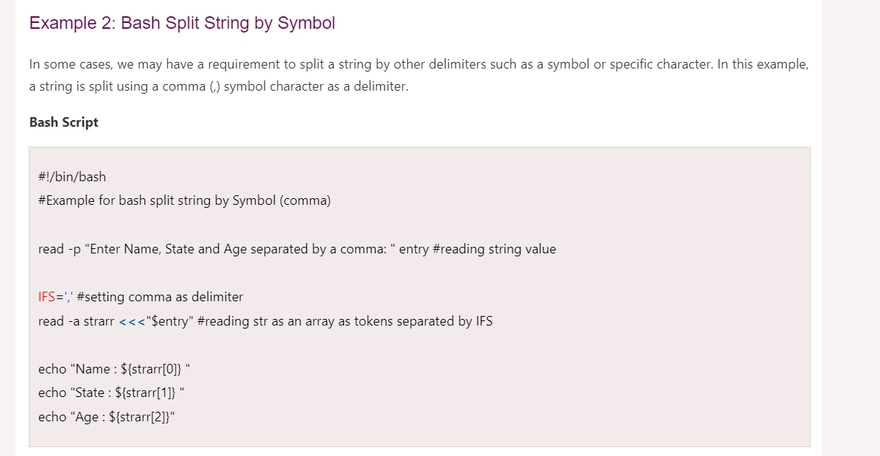 In some cases, we might need to split the string data to perform some specific tasks. Most of the programming languages contain built-in function 'split' to divide any string data into multiple parts. However, bash does not contain such type of built-in function. But we can use delimiters to split any string data in bash scripting. The delimiter can be either a single character or a string with multiple characters.