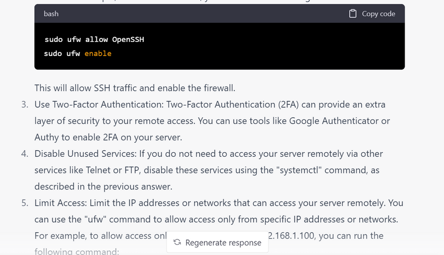 Secure remote access: Use secure remote access methods such as SSH and VPNs. Disable any unused remote access protocols and restrict access to only authorized users.