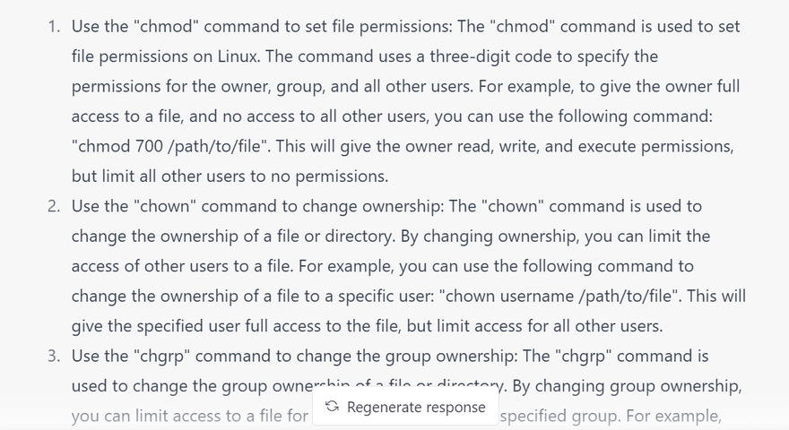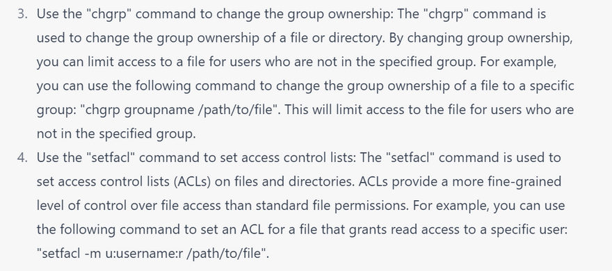 Configure file permissions: Use file permissions to restrict access to sensitive files and directories. You can use the chmod command to set file permissions, and the chown command to set ownership of files and directories.