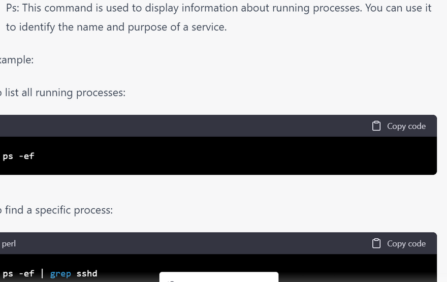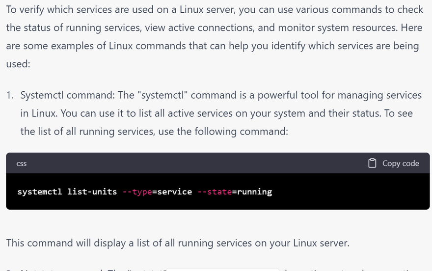 In Linux, there are several commands that can help you identify different services and their purposes. Here are a few examples: