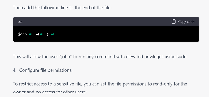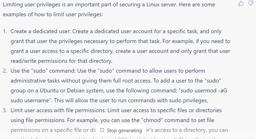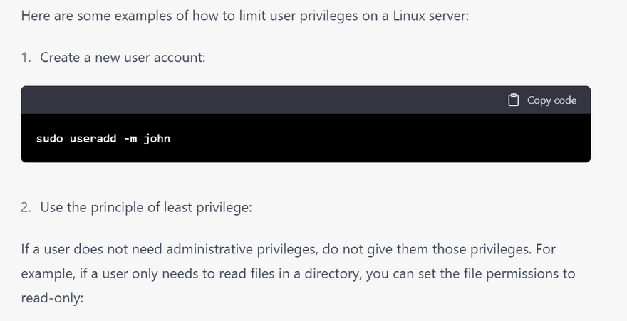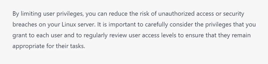 Limit user privileges: Only grant users the privileges they need to do their job. Avoid giving users root access or allowing them to log in as the root user.