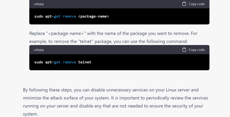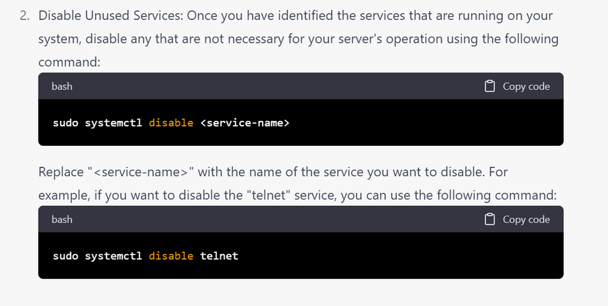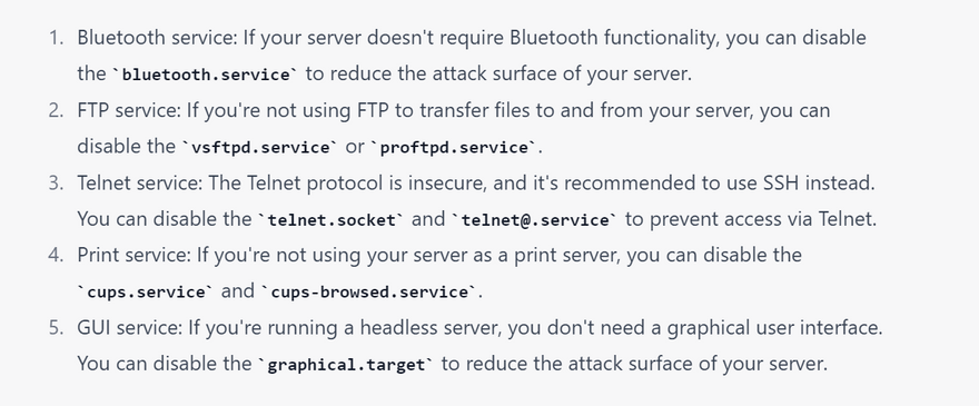 Disable unnecessary services: Turn off any unnecessary services that are not required for the server's operation. This reduces the attack surface and minimizes the risk of exploits.