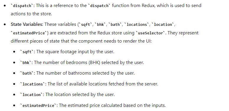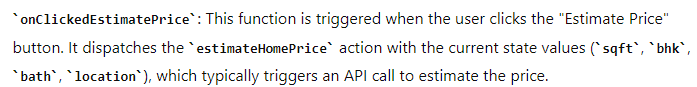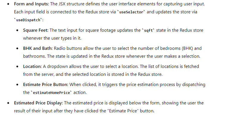 HomePricePredictor: This is a functional component that represents the user interface for predicting home prices. It manages the form inputs for square feet, BHK, bathrooms, and location, and allows the user to estimate the home price.