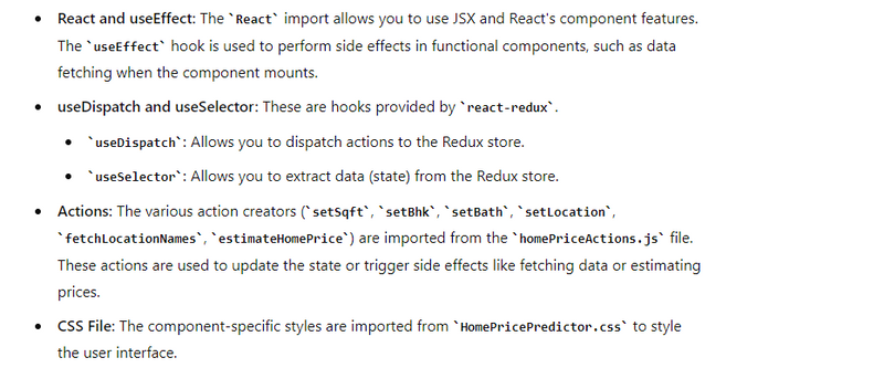 HomePricePredictor: A React component that is likely responsible for interacting with the Redux store and rendering the UI related to home price predictions.