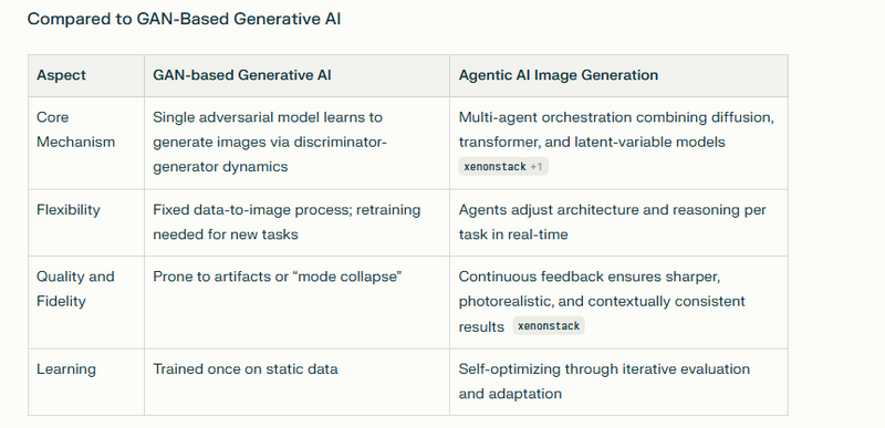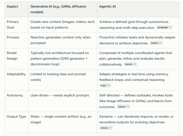 Agentic AI differs from generative image models like GANs primarily in purpose, structure, and autonomy. While generative models such as GANs focus on producing new images in response to human prompts, agentic AI operates at a higher level of intelligence — reasoning, planning, and executing complex image creation workflows autonomously