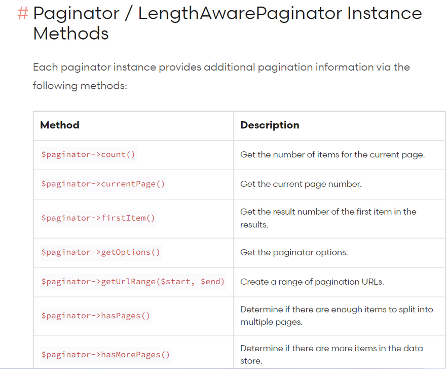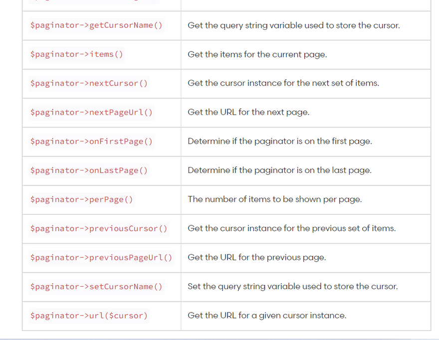 In other words, the Paginator corresponds to the simplePaginate method on the query builder, the CursorPaginator corresponds to the cursorPaginate method, and the LengthAwarePaginator corresponds to the paginate method.