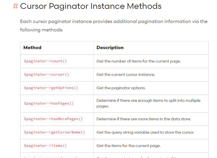 Unlike offset based pagination, which includes a page number in the query string of the URLs generated by the paginator, cursor based pagination places a "cursor" string in the query string. The cursor is an encoded string containing the location that the next paginated query should start paginating and the direction that it should paginate: