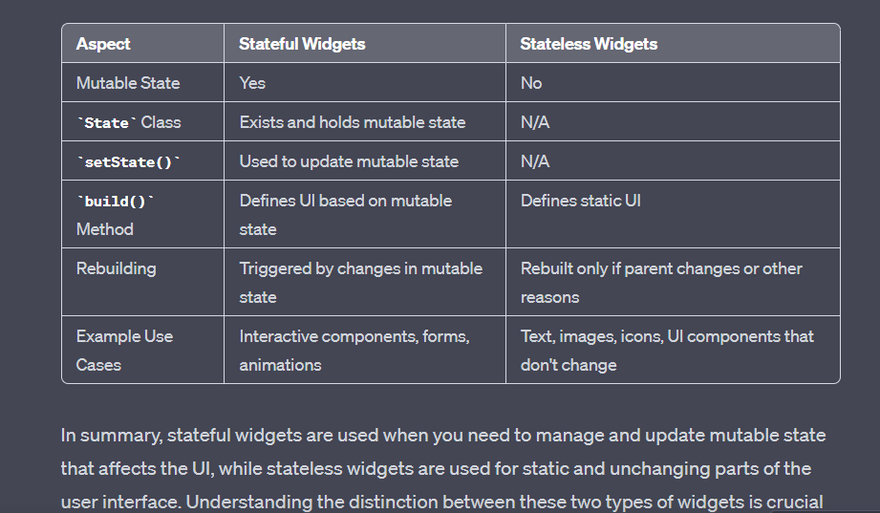 - Examples of stateless widgets include text, images, icons, and other static UI elements . Here's a simplified comparison
