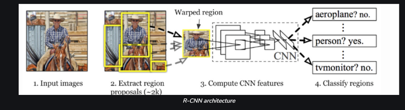 - R-CNN (Regions with CNN) uses a selective search algorithm to propose regions of interest (ROIs) in an image, and then uses a CNN to classify each ROI.