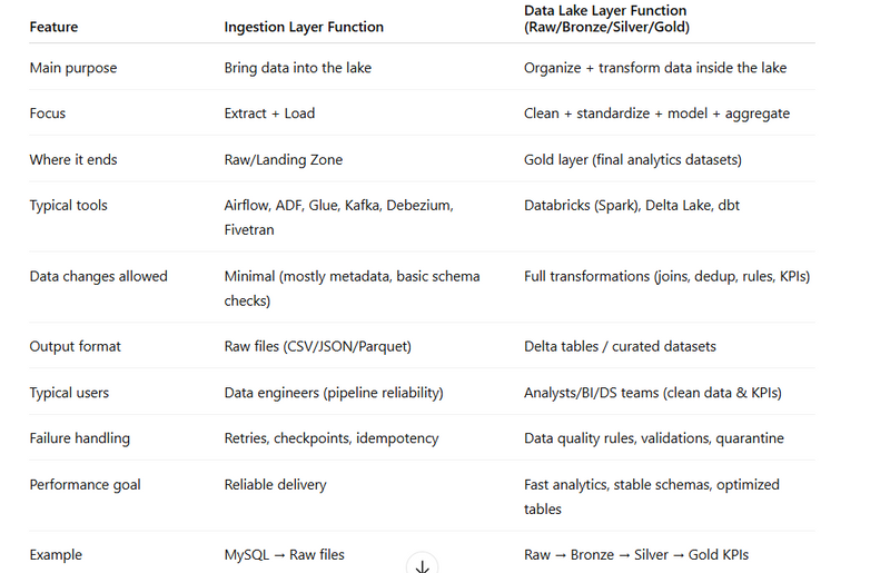 Tabular Comparison: Ingestion Layer vs Data Lake Layer Functions