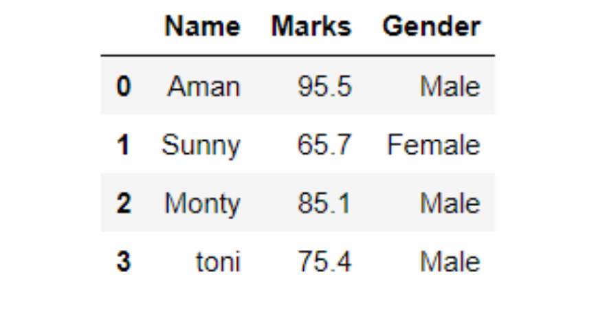 df = pd.DataFrame(age, columns=['Name', 'Marks', 'Gender'])