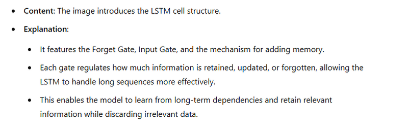Architecture: LSTMs are a type of RNN specifically designed to address the vanishing gradient problem. They include additional components called "gates" that regulate the flow of information through the network.