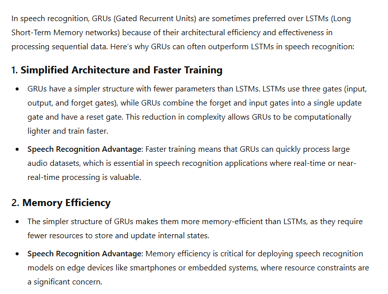 Pros and Cons: GRUs are computationally efficient and may be easier to train than LSTMs due to their simpler architecture. However, they may not perform as well as LSTMs on tasks that require capturing very long-term dependencies.