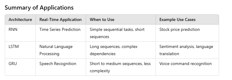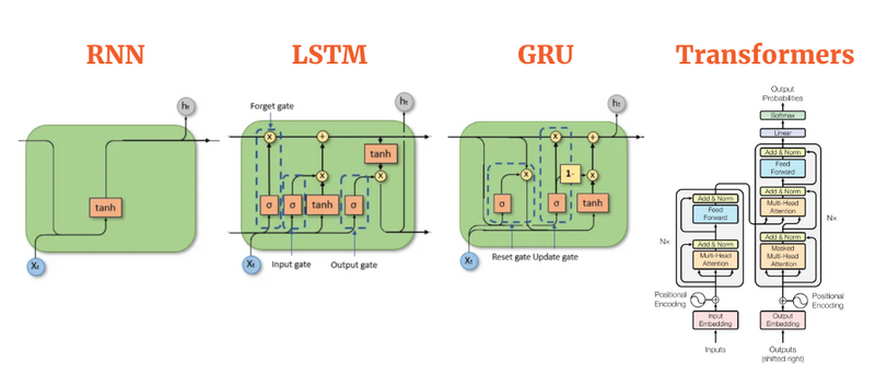 In summary, while RNNs, LSTMs, and GRUs are all types of recurrent neural networks used for processing sequential data, they differ in terms of their architecture, memory mechanisms, training algorithms, and performance characteristics. LSTMs and GRUs are extensions of basic RNNs designed to address the limitations of traditional RNNs in capturing long-term dependencies.