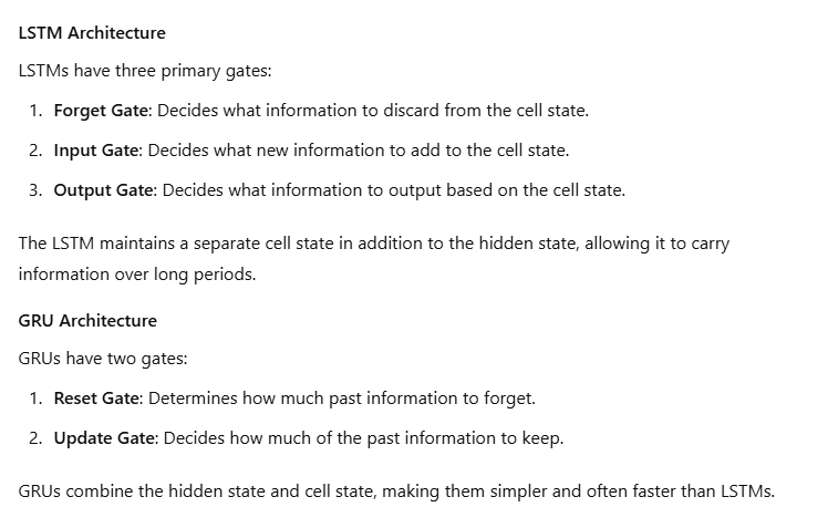 Architecture: GRUs are a variation of LSTMs that combine the forget and input gates into a single "update gate." They also merge the cell state and hidden state, simplifying the architecture compared to LSTMs.
