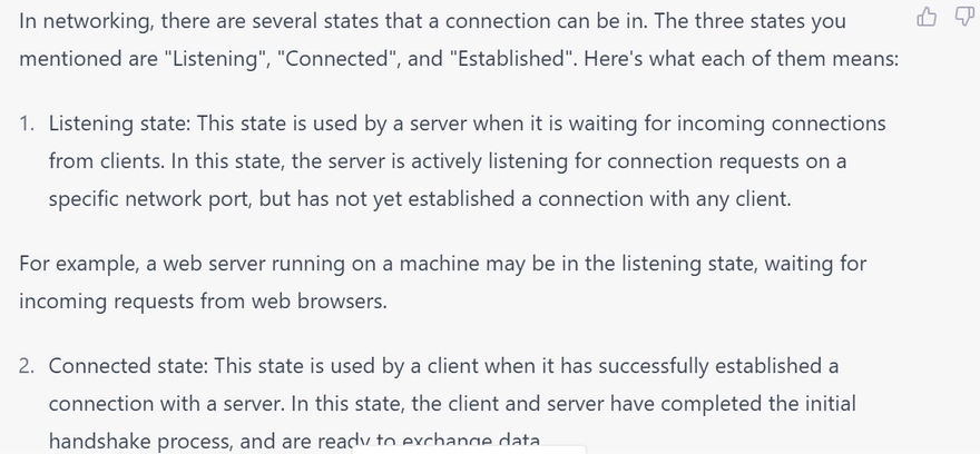 LISTENING: This state is used by a server socket to indicate that it is ready to accept incoming connections from clients. When a socket is in the LISTENING state, it is waiting for a client to initiate a connection. For example, when a web server is started, it enters the LISTENING state and waits for incoming requests from web clients.