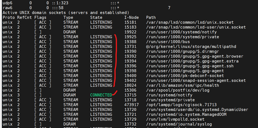 In network connection statistics, LISTENING and CONNECTED are two different states that a socket can be in. Here's the difference between the two states:
