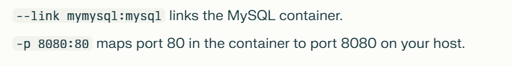 docker run --name app --link db:mysql -p 8080:80 -d my-php-app