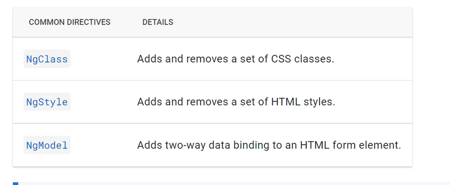 Examples of attributes directives are ngStyle, ngClass, ngModel