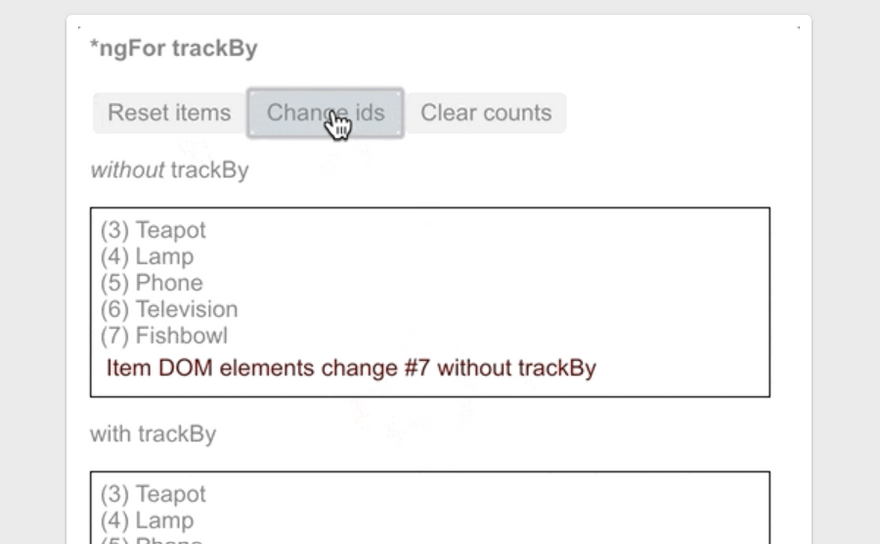 Change ids creates new items with new item.ids. In the following illustration of the trackBy effect, Reset items creates new items with the same item.ids.