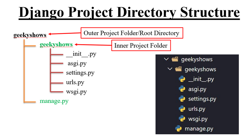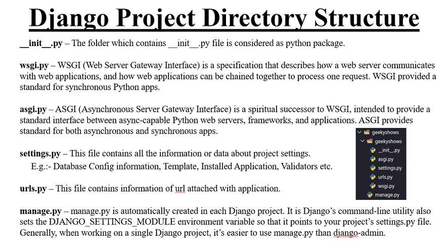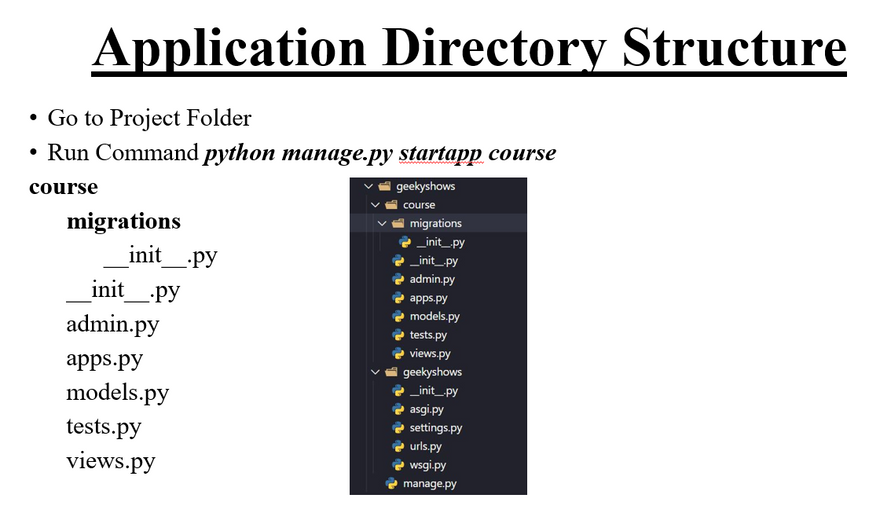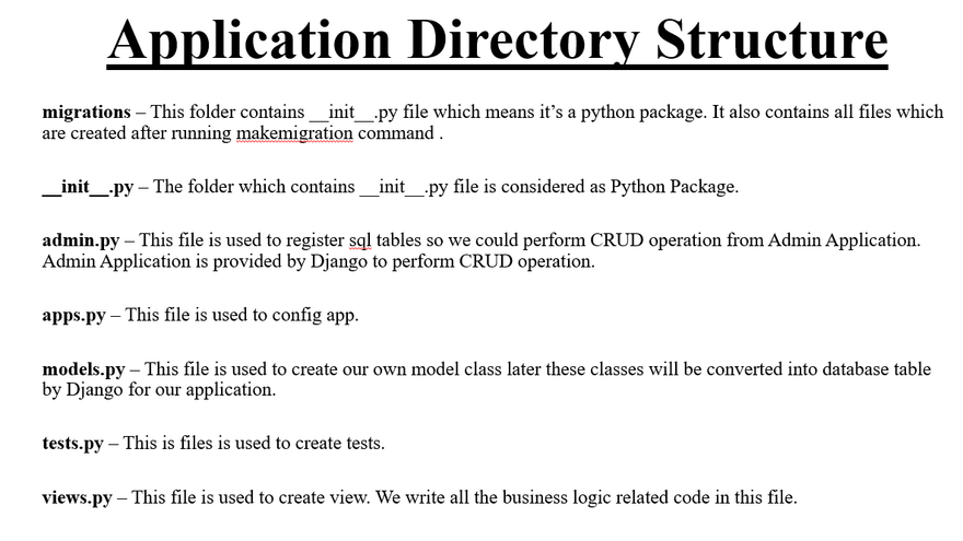 Django uses a directory structure to arrange the different parts of the web application. Now, we will learn about the Django app structure and the project structure in further detail here.