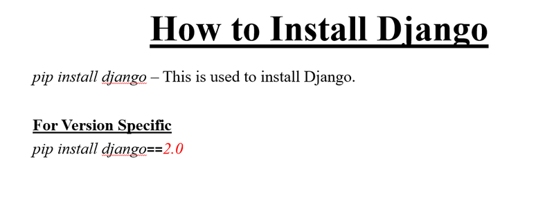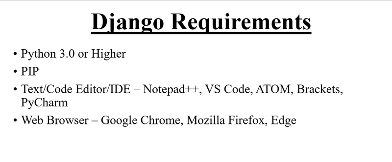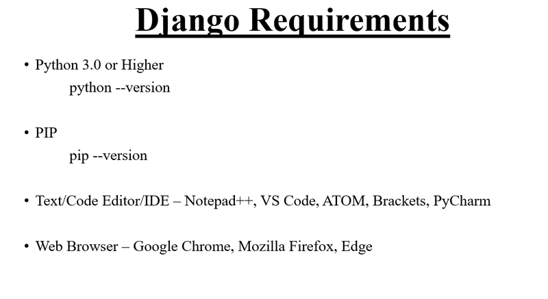 Django requires pip to start installation. Pip is a package manager system which is used to install and manage packages written in python. For Python 3.4 and higher versions pip3 is used to manage packages.