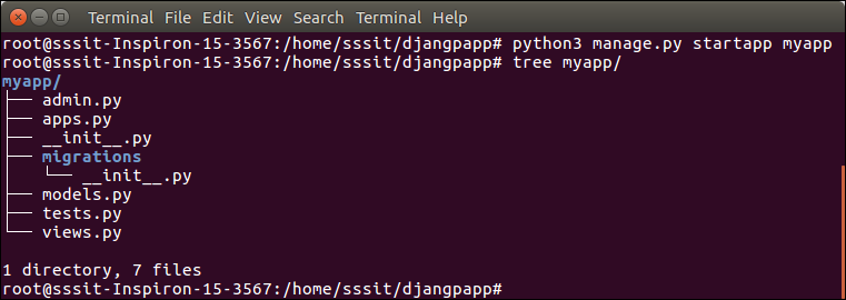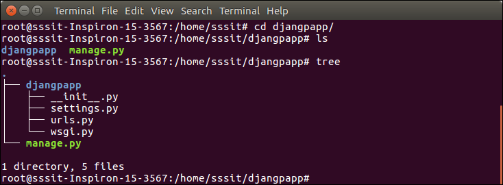 To see all the files and subfolders of django project, we can use tree command to view the tree structure of the application. This is a utility command, if it is not present, can be downloaded via apt-get install tree command.