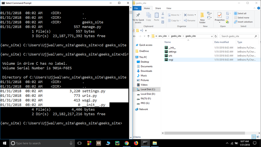 folder ( geeks_site ) – This folder contains all the packages of your project. Initially, it contains four files –