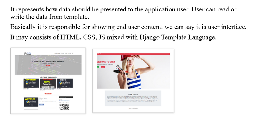 Just like View in MVC, Django uses templates in its framework. Templates are responsible for the entire User Interface completely. It handles all the static parts of the webpage along with the HTML, which the users visiting the webpage will perceive.