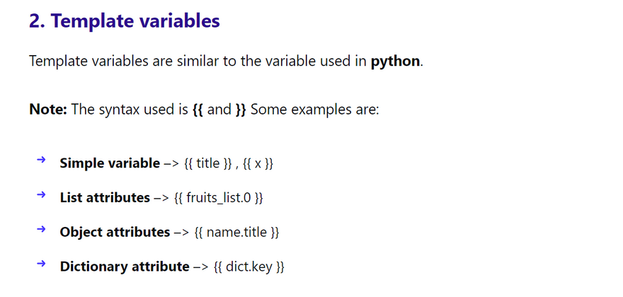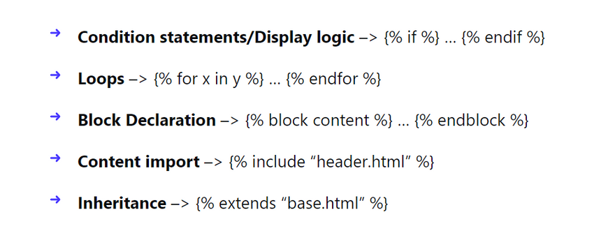 Note : A template tag is enclosed by {% and %}. Some examples are: