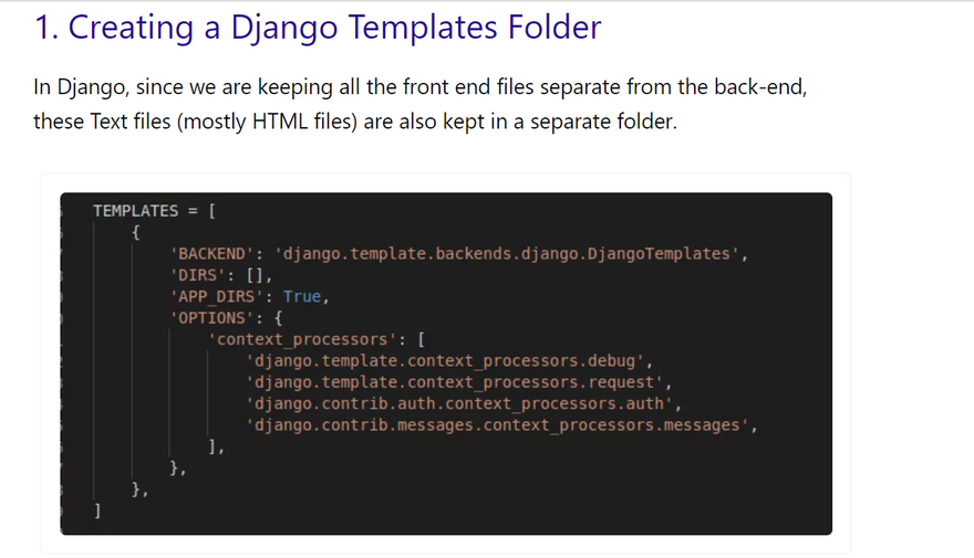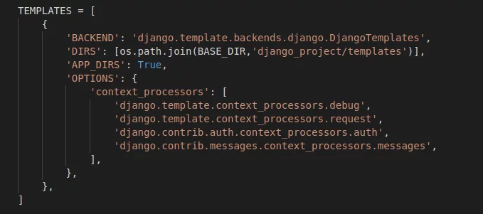 Now if we go to the settings.py, there will a TEMPLATES option as shown above. Now the important thing here is the APP_DIRS