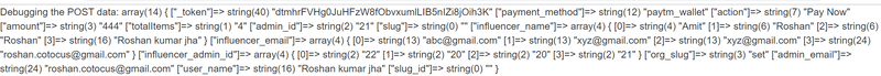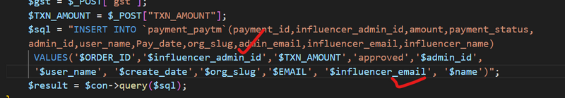 $sql = "INSERT INTO `payment_paytm`(payment_id,influencer_admin_id,amount,payment_status,admin_id,user_name,Pay_date,org_slug,admin_email,influencer_email,influencer_name) VALUES('$ORDER_ID','$influencer_admin_id','$TXN_AMOUNT','approved','$admin_id','$user_name', '$create_date','$org_slug','$EMAIL', '$influencer_email', '$name')";
