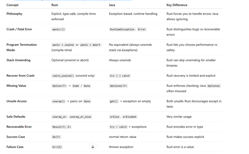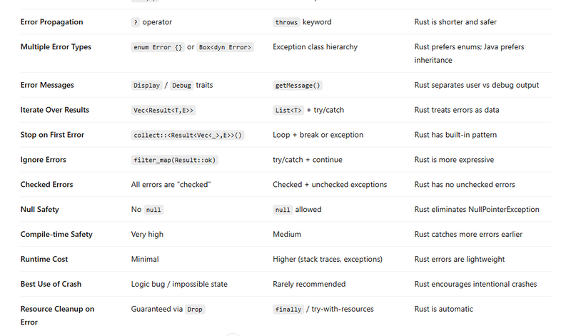 Error Handling: Rust vs Java (Complete Comparison Table)